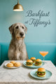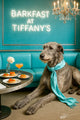 A laid-back wolfhound draped in a flowing teal scarf lounges on a plush Tiffany-blue banquette beneath twin crystal chandeliers and a glowing neon “Barkfast at Tiffany’s” sign. At the riveted round metal table before him, three artful tomato-forward bites await: puff-pastry rectangles piled with roasted cherry tomatoes, delicate circular tartlets crowned with tomato and herb, and buttery brioche rounds topped with halved tomatoes. A pale apricot cocktail shimmers in an elegant coupe, completing this perfectly playful moment of canine charm and brunch indulgence.