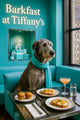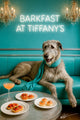 Beneath a warm brass pendant, a dignified wolfhound perches on a plush teal banquette at a marble-topped table, its soft grey wiry coat rendered in exquisite photorealistic detail. On a pristine white plate, four golden cheese scones dusted with flaky sea salt await beside matching teal plates piled high with miniature arugula-topped sliders. A pale apricot cocktail shimmers in an elegant coupe, casting a gentle glow across this playful vignette of canine elegance and brunch-time indulgence.