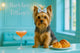 A curious Yorkshire terrier leans forward in a bright teal nook to sniff a white plate piled with buttery mini croissants and pastel-hued macarons. Two stacked Tiffany-blue gift boxes tied with crisp white ribbons peek from the background, while soft overhead lighting casts a gentle glow on this playful pastry moment. Every detail—from the dog’s silky tan-and-gray fur to the flaky layers of the croissants—is captured in vibrant color and sharp clarity.