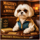 - Design: Maltese in teal vest and cinnamon bowtie, surrounded by Snout Notes, Sruff Bucks, Bark Reserve tins, Melty Treat Co. canister, and stacks of doggy dough