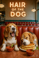 Two beagles take “Hair of the Dog” literally—one savoring a whipped-cream-topped drink crowned with a crispy bacon garnish, the other snoozing on the checkered diner floor. The retro counter, chrome details, and warm neon glow set the stage for a playful morning-after vignette that dog lovers and brunch fans will instantly recognize.
