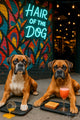 - Subject: Trio of bulldogs at a cozy brunch beneath the “Hair of the Dog” neon