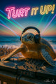 "Turt It Up!" is a vibrant, high-definition metal print featuring a charismatic turtle DJ spinning records at a lively seaside party. It combines tropical color, musical energy, and beachside whimsy in one joyful artwork.
