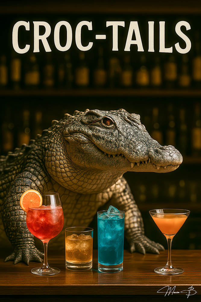 "Croc Tails II" is a vibrant metal wall art print featuring a stylish crocodile bartender serving up cocktails. It combines humor, vivid color, and high-end craftsmanship to create a fun and engaging piece for any space.