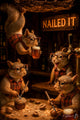 "Nailed It II" captures the nutty brilliance of squirrels hard at work—and play—in a forest workshop turned tavern. One squirrel, chisel in paw, carves a walnut shell atop a tree-slice table. Nearby, its bespectacled buddies raise frothy ales in celebration beneath a glowing pinecone pendant. Above them, a “Nailed It II” sign honors their latest woodworking (and drinking) triumph. The rustic wood textures, precise fur details, and warm lighting bring the scene to life with cozy woodland charm.