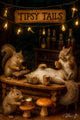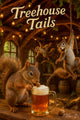 "Tipsy Treetops" whisks you high into the forest canopy where squirrels celebrate with mugs of ale and mischievous glee. One squirrel dangles from a rope ladder, pouring beer into a giant mug perched below—foam rising as a walnut lands squarely atop. Another squirrel snaps a selfie with its phone while a third watches the fizzy chaos unfold. A glowing “Tipsy Treetops” sign anchors this joyful arboreal bar scene above a sea of lush green leaves.