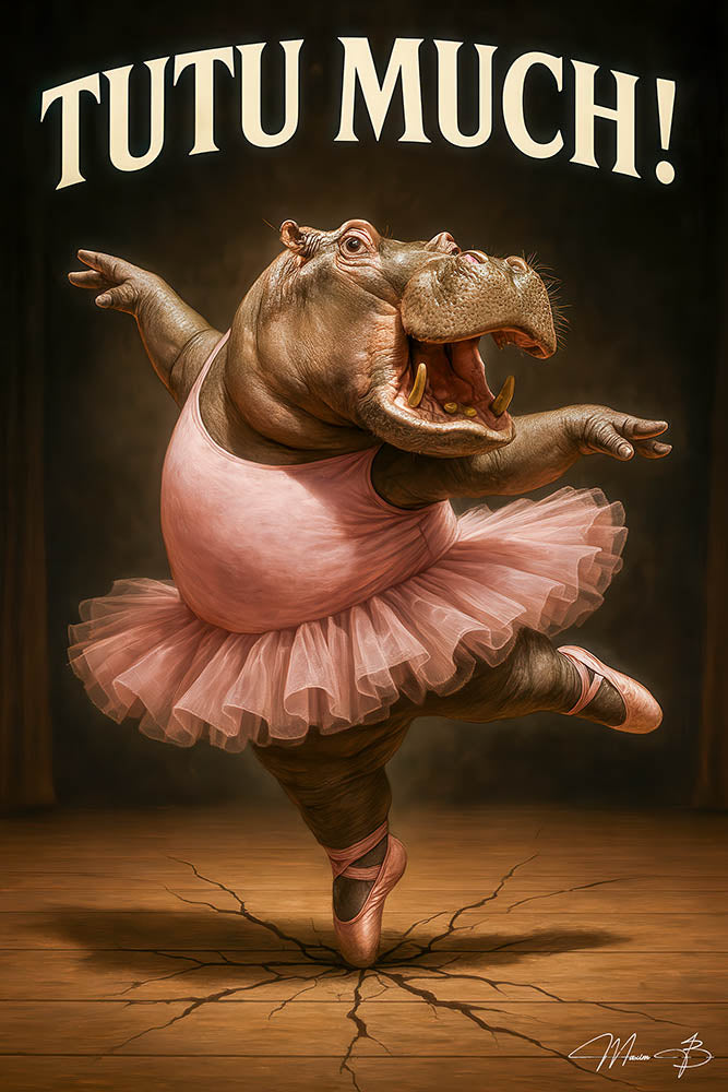 "Tutu Much!" is a whimsical, high-definition metal print featuring a ballerina hippopotamus dancing in a tutu. It's a joyful mix of humor and grace that brings smiles to anyone who sees it.