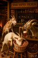 "The Tipsy Horn" invites you into the coziest bar in the forest, where goats unwind under lantern light and a raccoon bartender keeps the taps flowing. One goat hums into the ale-scented air, another leans back mid-sip, and a kid face-plants in a basket of nuts—bringing barroom bliss and barnyard comedy together in one vibrant scene.