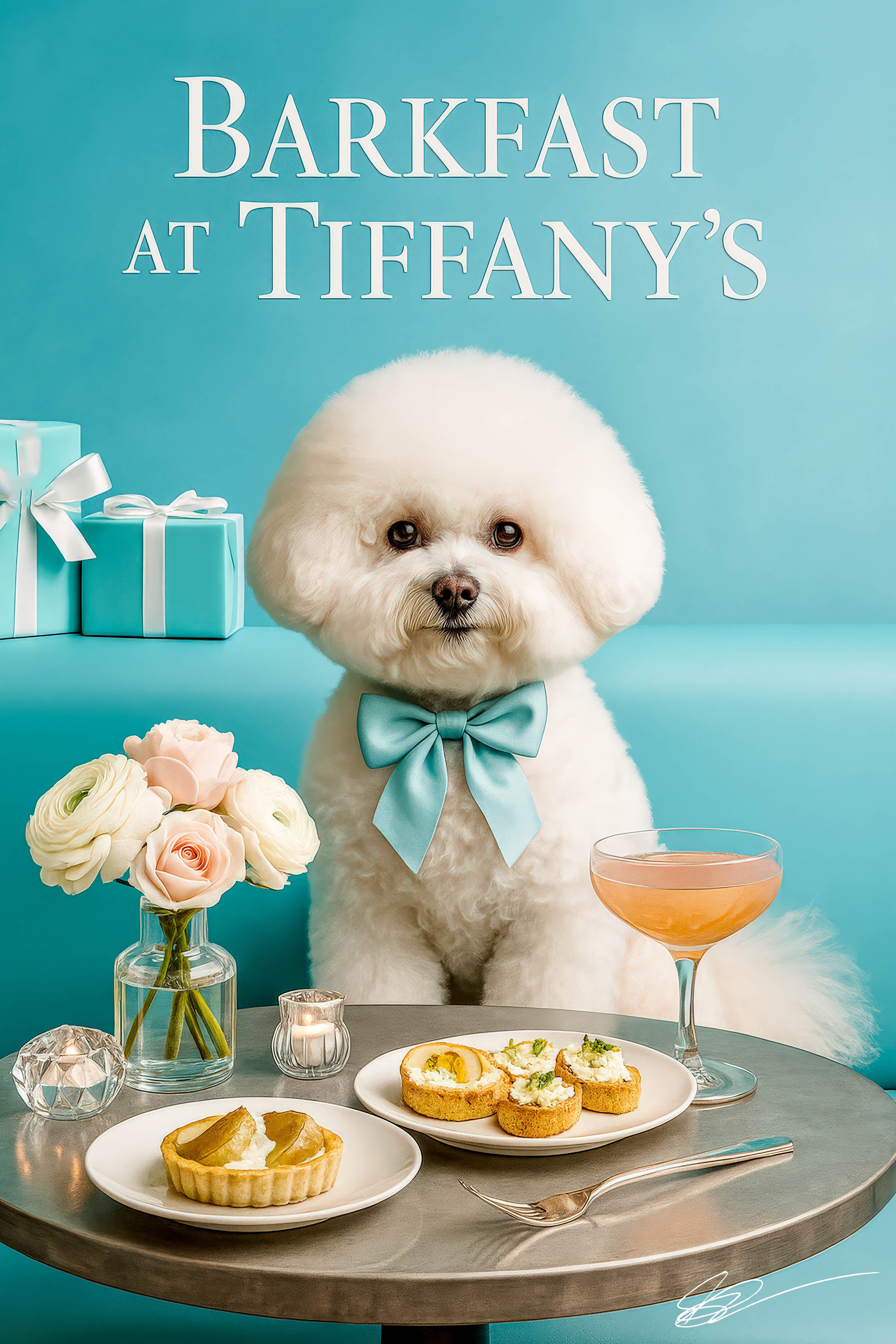 Elevate your walls with Bichon Frise, the most refined brunch guest you’ll ever meet. Perched on a plush Tiffany-blue banquette in front of a cubby stacked with iconic gift boxes, this photorealistic pup—tuxedoed in a satin bow tie—sets its sights on an elegant tableau: delicate mini tarts crowned with whipped cream and herbs, a luscious pear-topped tart, a frothy peach cocktail, and the warm glow of candlelight and fresh blooms.