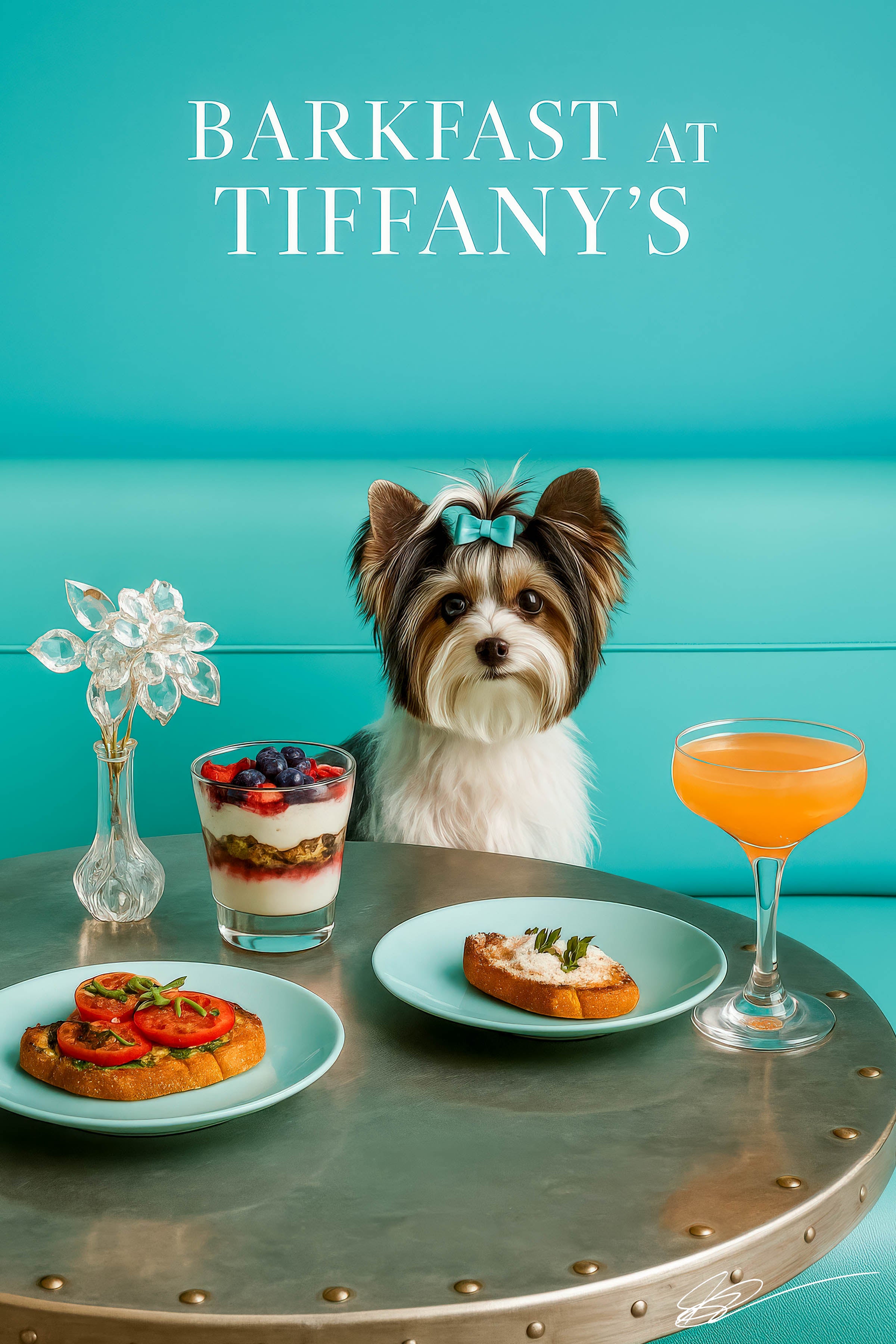 Elevate your walls with Biewer Terrier VI, the ultimate brunch gourmand. Draped in a satin Tiffany-blue bow and posed on a matching banquette beneath the playful “Barkfast at Tiffany’s” marquee, this photorealistic pup surveys an artful marble-top spread: a layered berry parfait, tomato-topped bruschetta, a herbed ricotta toast, and a frothy peach-hued cocktail—where tongue-in-cheek luxury meets everyday whimsy.