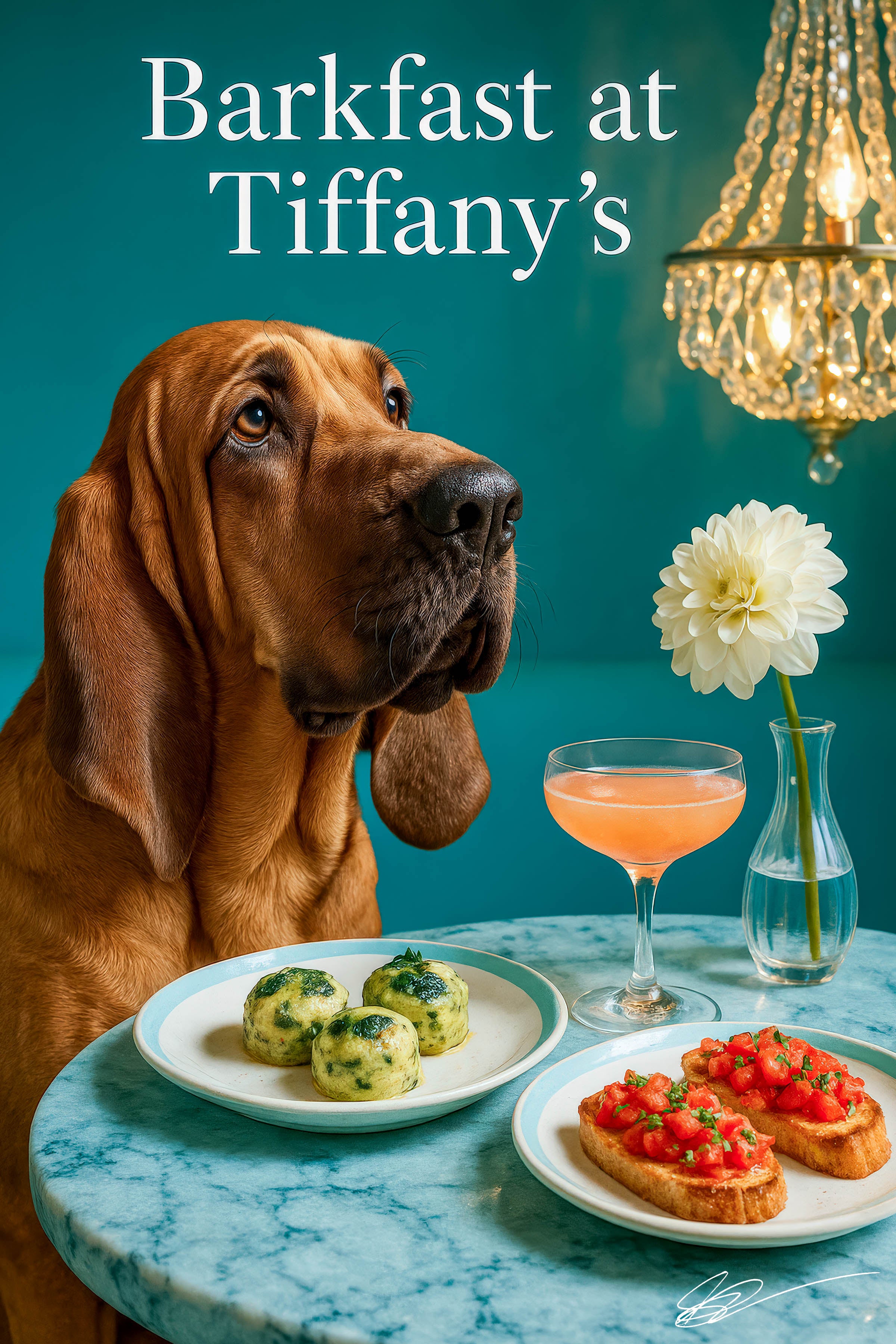 Elevate your walls with Bloodhound II, the ultimate brunch detective you never knew you needed. Poised beneath a sparkling chandelier against lush Tiffany-blue walls, this photorealistic hound surveys an elegant spread: three spinach-infused egg bites, two tomato-topped bruschetta slices, a frothy peach cocktail, and a single white dahlia in a sleek vase—where tongue-in-cheek luxury meets hound-worthy humor.