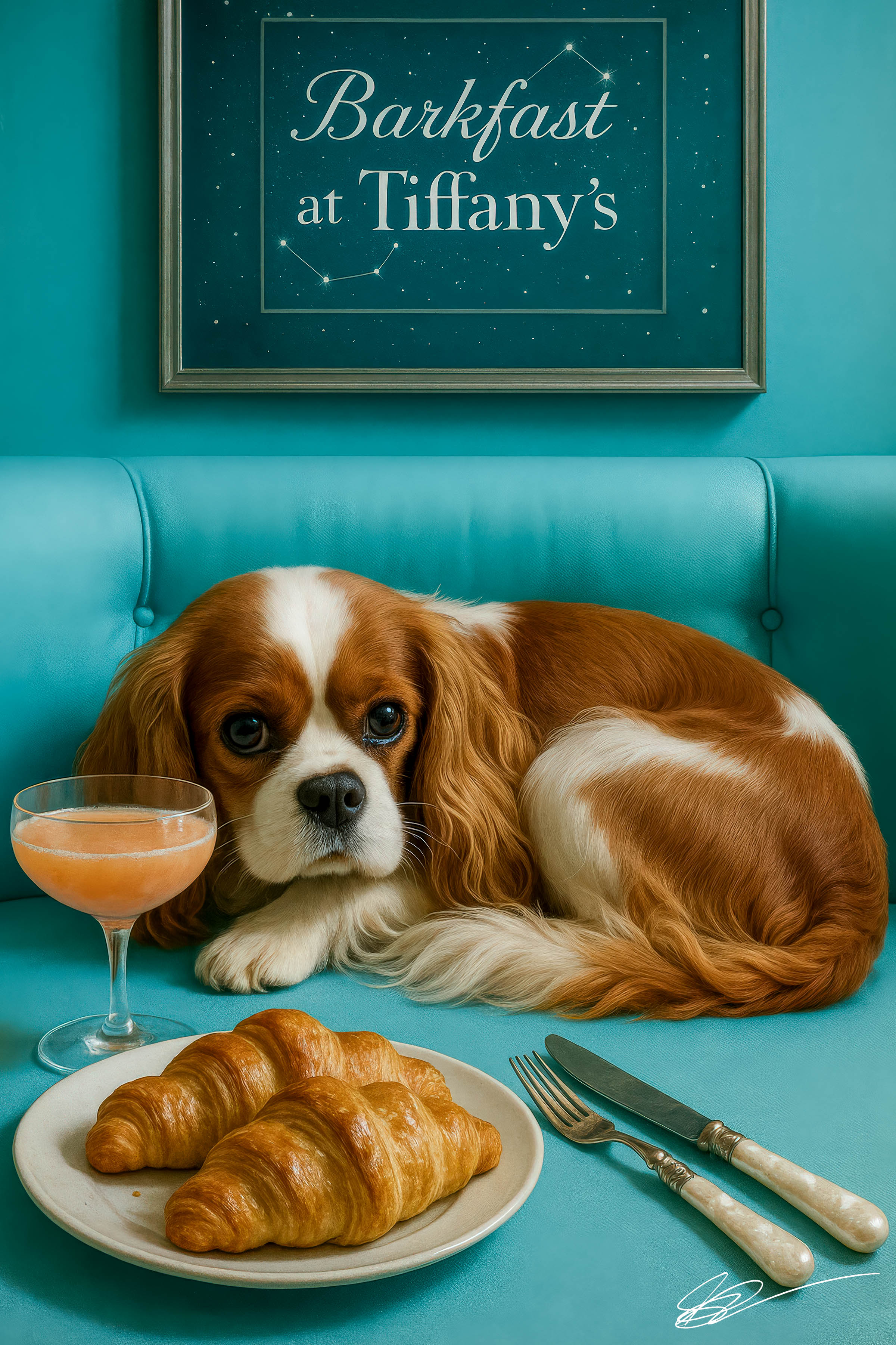 This vibrant metal print features a photorealistic Cavalier King Charles Spaniel lounging on a turquoise banquette beside golden croissants and a peach-hued cocktail coupe, all beneath the iconic Barkfast at Tiffany’s constellation sign. High-definition printing on a sturdy metal surface brings this luxury brunch scene to life with striking clarity and depth, making it a standout piece of dog-themed home décor.