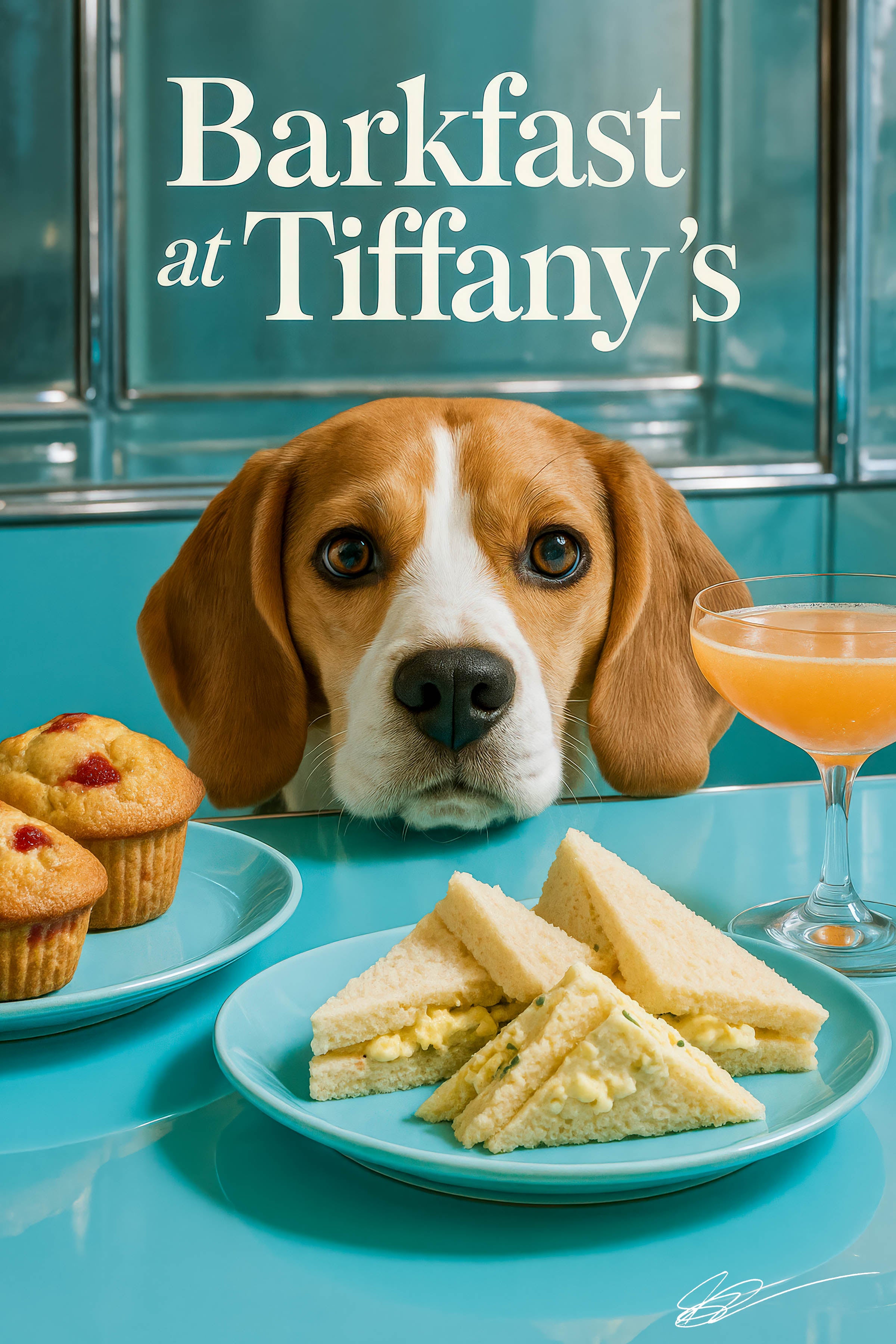 Elevate your walls with Beagle IV, the most stylish brunch companion you’ll ever meet. Rendered in sumptuous Tiffany-blue tones and photorealistic detail, this posh beagle gazes longingly at a gourmet spread of egg-salad tea sandwiches, strawberry muffins, and a frothy cocktail—blending upscale home décor with a hearty dose of humor.