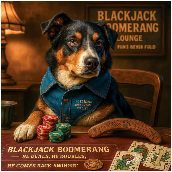 Blackjack Boomerang Lounge is a metal art print featuring a confident Australian Shepherd dealing poker with a boomerang at his side. It blends humor, culture, and style into one high-stakes, Aussie-inspired scene.