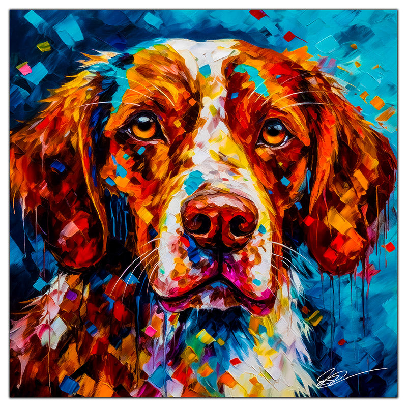 Brittany, a captivating and charming furry companion, comes to life in this exquisite palette knife painting style on stunning ChromaLuxe Metal Prints. Limited edition are artist-signed and numbered. This artwork beautifully captures the unique characteristics and personality of the Brittany, creating a lasting and modern artwork.