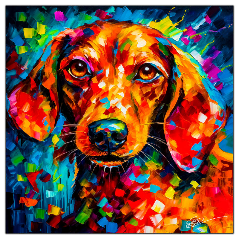Dachshund, a captivating and charming furry companion, comes to life in this exquisite palette knife painting style on stunning ChromaLuxe Metal Prints. Limited edition are artist-signed and numbered. This artwork beautifully captures the unique characteristics and personality of the Dachshund, creating a lasting and modern artwork.