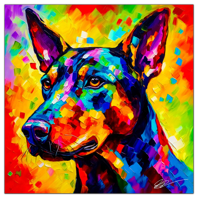 Dobermann, a captivating and charming furry companion, comes to life in this exquisite palette knife painting style on stunning ChromaLuxe Metal Prints. Limited edition are artist-signed and numbered. This artwork beautifully captures the unique characteristics and personality of the Dobermann, creating a lasting and modern artwork.