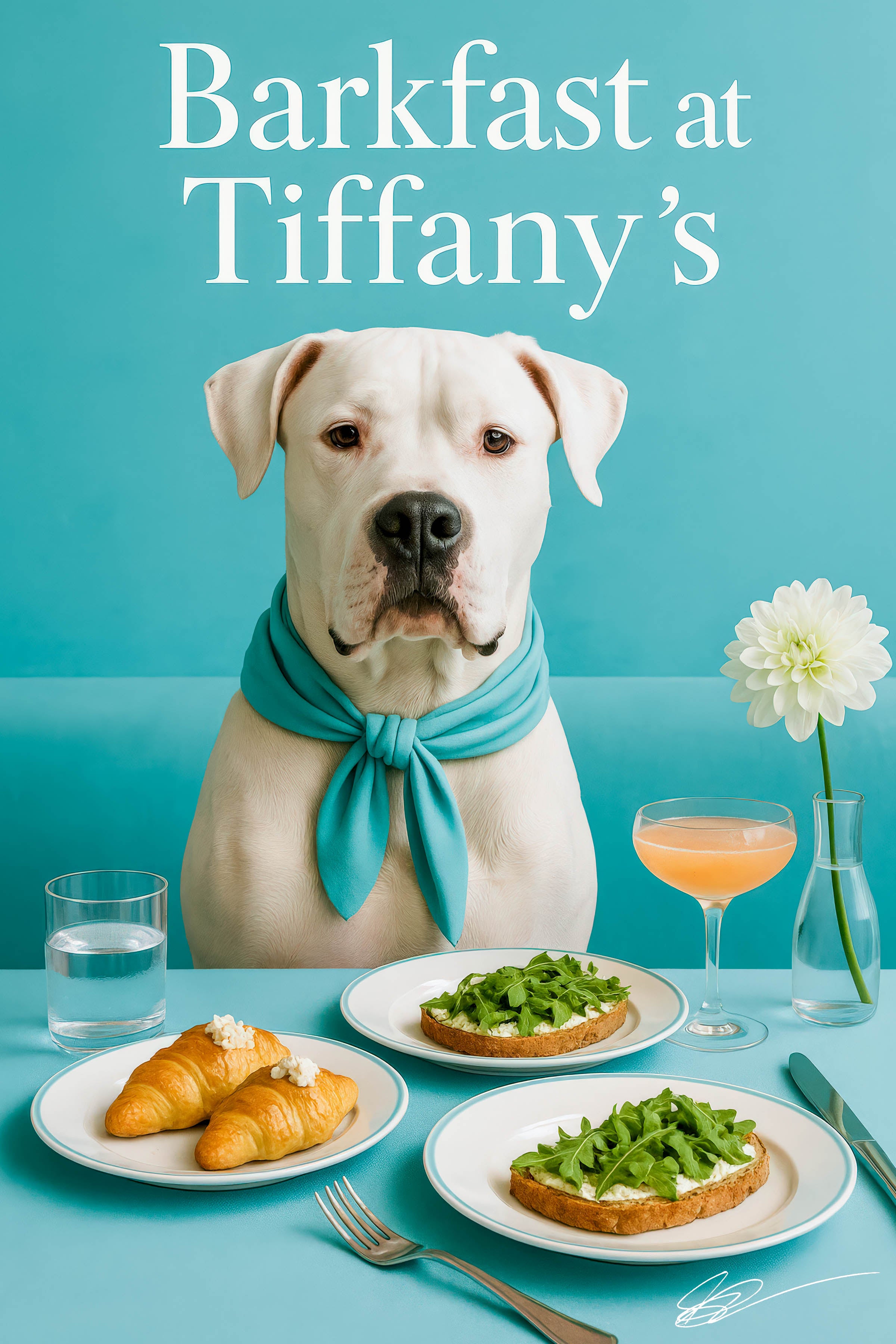 - Design: Dignified Dogo Argentino draped in a turquoise scarf on a matching banquette beneath the “Barkfast at Tiffany’s” logo, with a table set with miniature croissants crowned with creamy cheese, whipped-cheese & arugula toast slices, a crystal-clear water glass, a frothy peach cocktail, and a single white bloom