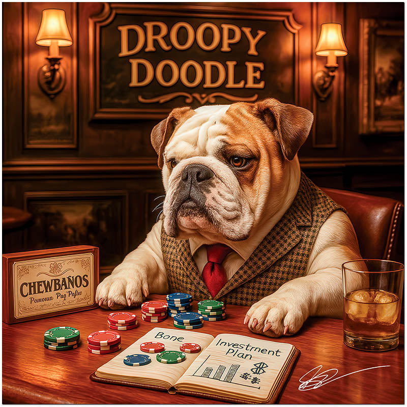 Droopy Doodle invites you into a world of refined humor and canine charisma. This English Bulldog lounges in thoughtful repose, surrounded by playful luxury—his “Bone Investment Plan,” a glass of spirits, a well-stocked box of “Chewbanos,” and a pile of poker chips. With just the right balance of wit and elegance, this artwork captures the soulful spirit of leisure and loyal companionship.