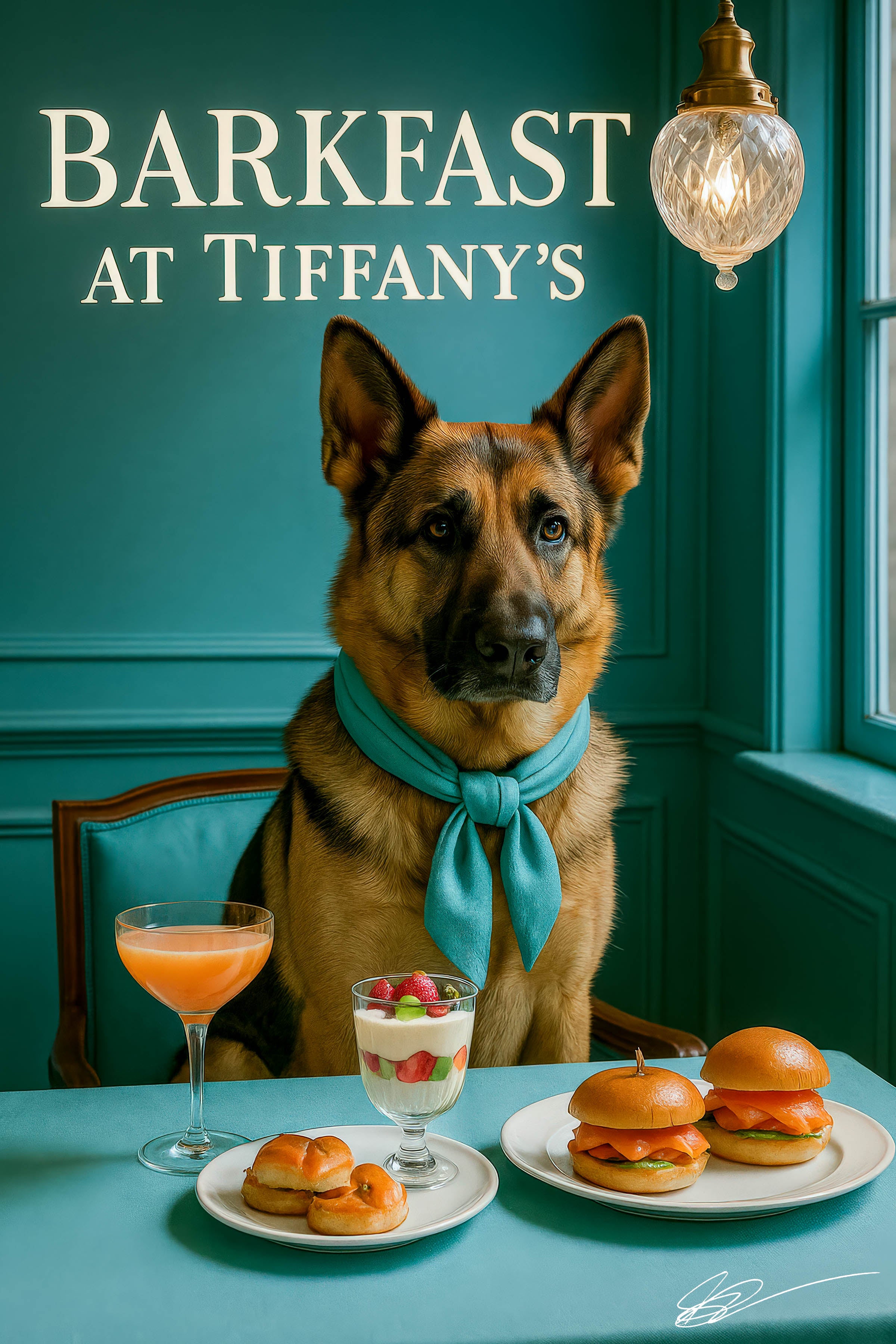 Add a dash of canine charm to your walls with German Shepherd, a vibrant Metal Print featuring a dignified German Shepherd draped in a teal scarf. He’s seated at a matching banquette by a sunlit window, surveying a teal tabletop laden with two smoked-salmon sliders nestled in brioche buns, a layered strawberry parfait in a footed glass, a pair of mini pretzel knots, and a frothy coral-hued cocktail. Polished globe lighting and brass-trimmed panels frame the scene, while the high-gloss finish makes every color and detail gleam for years to come.