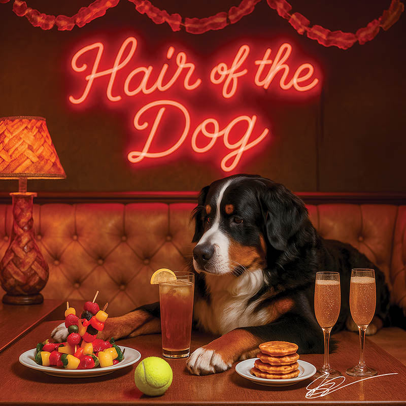Hair of the Dog Bernese Mountain Dog 007 Ruff & Ready Funny Canine Art neon lights, bacon-woven flair, and egg murals