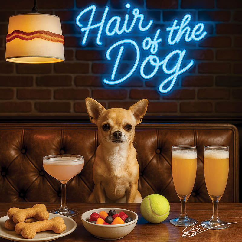 Bring home Chihuahua's Neon Brunch Bash, a playful centerpiece ready to spark conversation. Printed on ChromaLuxe™ Dye-Sub Metal, the neon “Hair of the Dog” glow, bacon-woven accents, and sunny-side-up egg murals burst with lifelike color. Durable and fade-resistant, this piece captures Chihuahua’s poised gaze and whimsical bar décor in stunning clarity—ideal for dog lovers seeking art with personality.
