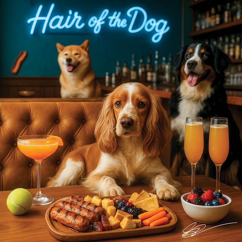 Bring home Cocker Spaniel's Neon Brunch Bash, a playful centerpiece ready to spark conversation. Printed on ChromaLuxe™ Dye-Sub Metal, the neon “Hair of the Dog” glow, bacon-woven accents, and sunny-side-up egg murals burst with lifelike color. Durable and fade-resistant, this piece captures Cocker Spaniel’s poised gaze and whimsical bar décor in stunning clarity—ideal for dog lovers seeking art with personality.