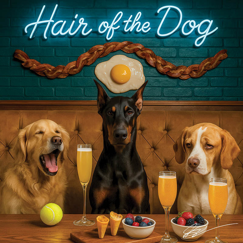 Hair of the Dog Doberman Pinscher 002 Ruff & Ready Funny Canine Art neon lights, bacon-woven flair, and egg murals