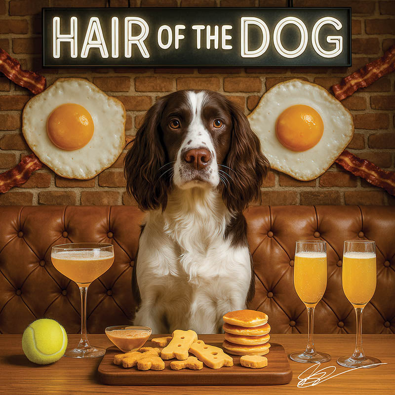 Bring home English Springer Spaniel's Neon Brunch Bash, a playful centerpiece ready to spark conversation. Printed on ChromaLuxe™ Dye-Sub Metal, the neon “Hair of the Dog” glow, bacon-woven accents, and sunny-side-up egg murals burst with lifelike color. Durable and fade-resistant, this piece captures English Springer Spaniel’s poised gaze and whimsical bar décor in stunning clarity—ideal for dog lovers seeking art with personality.