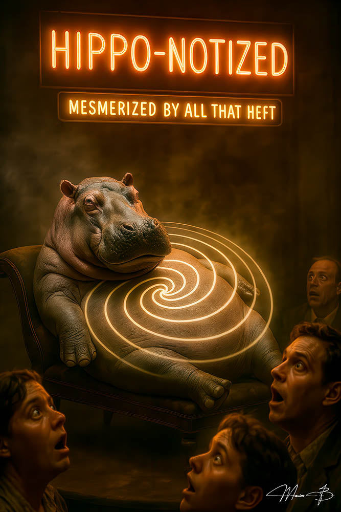 "Hippo-Notized" is a high-definition metal print featuring a hypnotist hippo captivating an enchanted crowd. With theatrical lighting, vibrant tones, and surreal humor, it’s a showstopping piece that’s equal parts charm and whimsy.